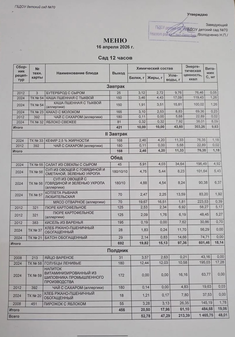 Меню ежедневного горячего питания (в том числе для детей с ОВЗ)
