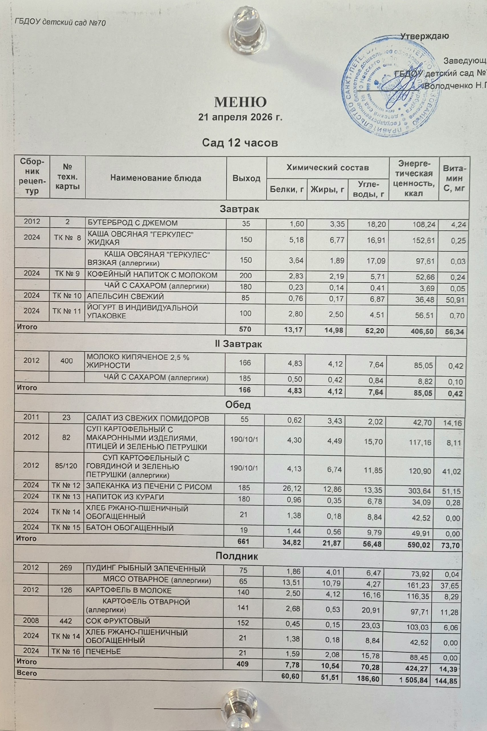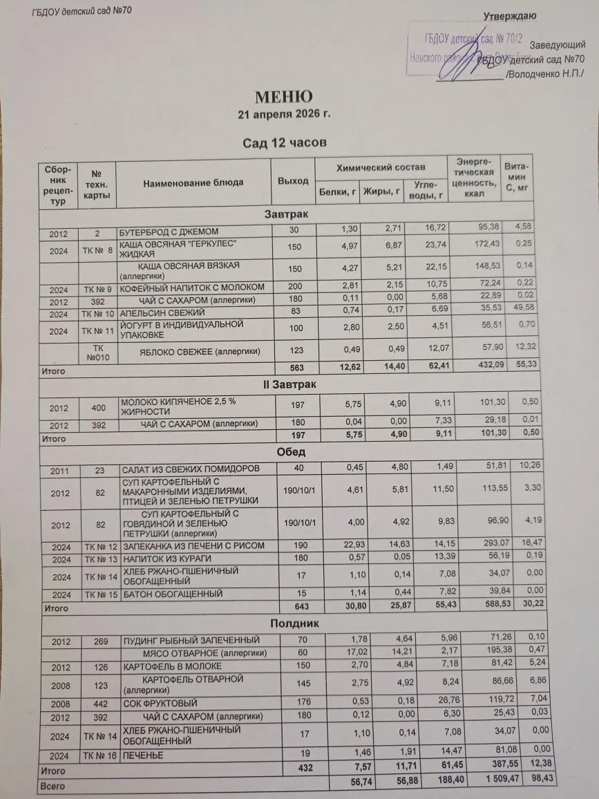 Меню ежедневного горячего питания (в том числе для детей с ОВЗ)